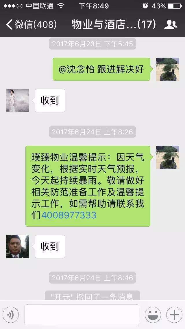 • 630日起的暴雨让普瑞物业公司的物业服务工作经受了考验。其中,璞臻分公司泊富国际大厦项目部作为大型综合体的服务方,在暴雨来临前,由客服部通过公告、微信朋友圈等多种方式提前发布暴雨预警提示,温馨提醒业主注意出行安全。项目负责人王志华副总经理第一时间召集项目相关人员制定防汛计划和险情预案,从630日起,24小时设备监测巡查,24小时清洁保洁维护到位,同时根据经验,提前在车库出入口设立了防洪挡板、防洪沙包,对倒灌进入的雨水启动抽水泵进行抽取。随时清理积水。在雨势最大的630日、71日确保各处无积水,保障业主财产不受损害。