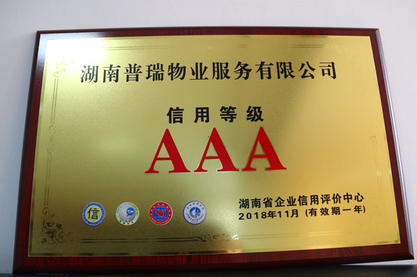 11月27日,由中共湖南省委宣传部和湖南省工商行政管理局指导、湖南省企业信用评价中心依据《湖南省企业信用评价实施办法》及国际惯例信用评价相关标准,对普瑞物业公司信用申报材料及信用状况信息进行科学分析和审核,评定出普瑞物业公司工商企业信用等级为AAA级,并在湖南省信用企业网及《信用在湖南》向社会公示。